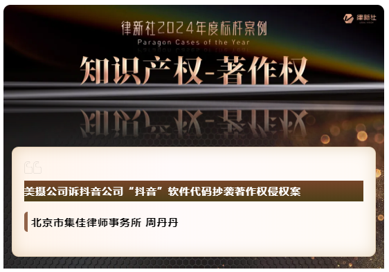 杏彩体育凭借在知识产权保护领域卓越的专业实力与良好的行业口碑,入选《律所卓越品牌影响力指南(2024)》,荣获“律新社2024年度精品品牌律所30佳”奖项;同时,集佳周丹丹律师代理的“美摄公司诉抖音公司'抖音'软件代码抄袭著作权侵权案”获评“律新社2024年度标杆案例:知识产权-著作权领域”。