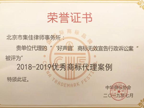 >杏彩体育>关于我们>荣誉概览>2019>集佳代理“好声音”商标无效宣告行政案入选“优秀商标代理案例”