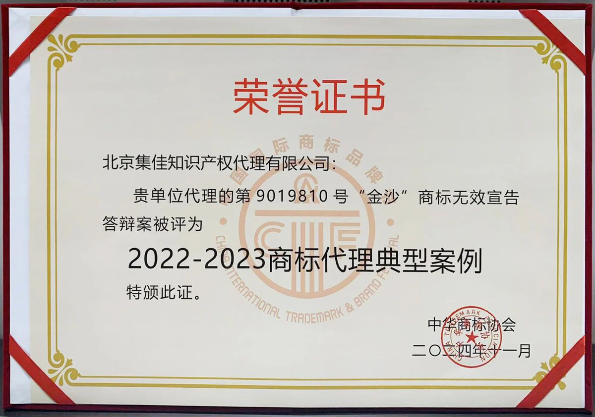 >杏彩体育>关于我们>荣誉概览>2024>集佳代理的“金沙”商标权无效宣告答辩案入选“2022-2023商标代理典型案例”