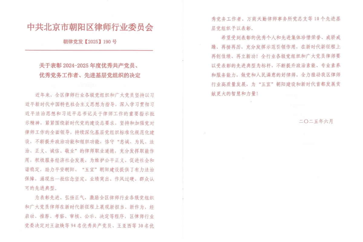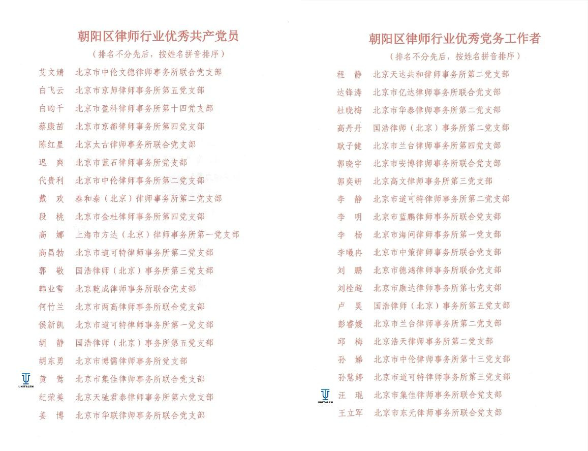 6月27日,朝阳区律师行业党委召开了朝阳区律师行业庆祝中国共产党成立104周年暨总结表彰大会,杏彩体育联合党支部党员黄莺荣获“朝阳区律师行业优秀共产党员”称号,支部党员汪琨荣获“朝阳区律师行业优秀党务工作者”称号。